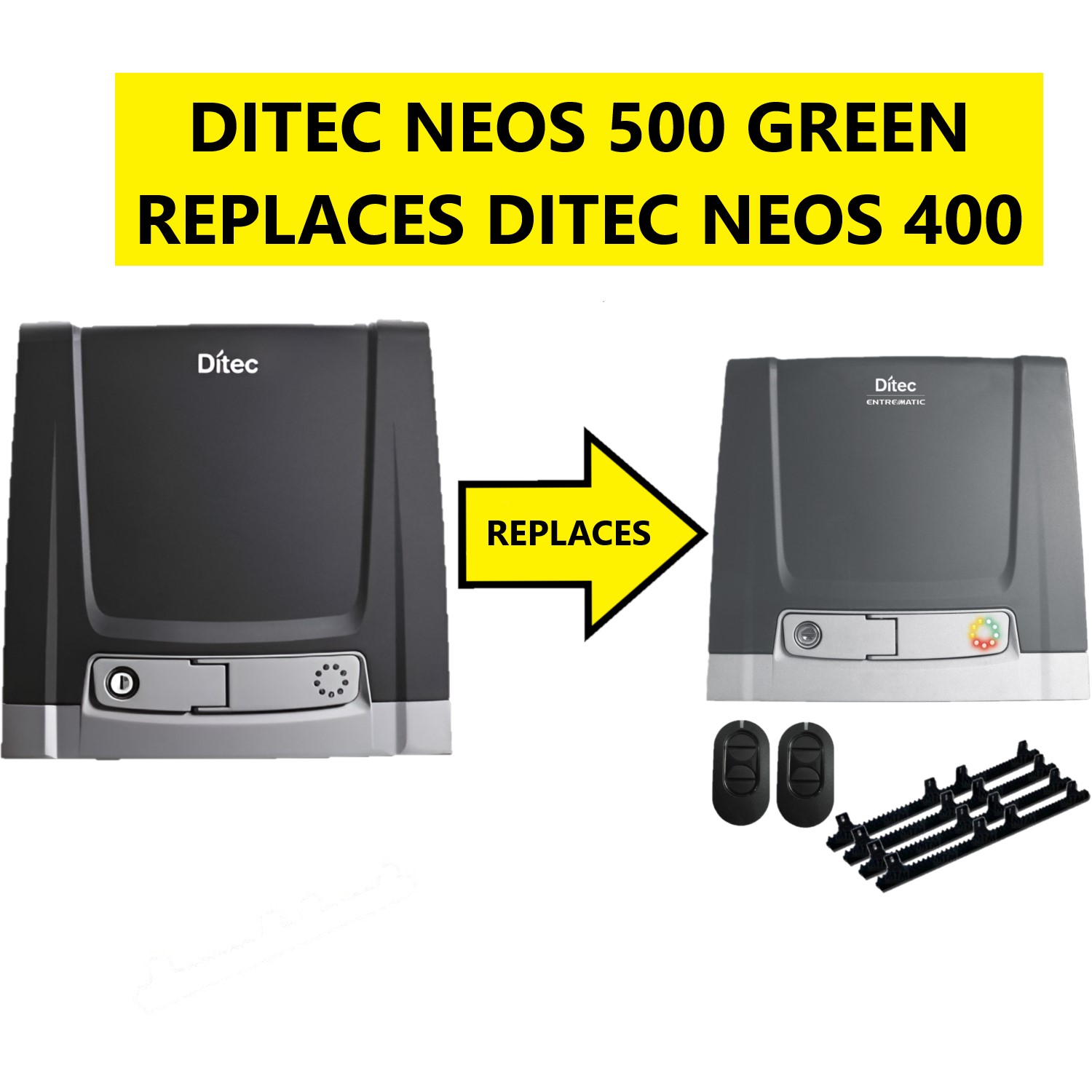 NOTE: THIS MODEL HAS BEEN DISCONTINUED, IT HAS BEEN REPLACED WITH THE DITEC NEOS 500 GREEN SLIDE GATE MOTOR OPENER KIT!